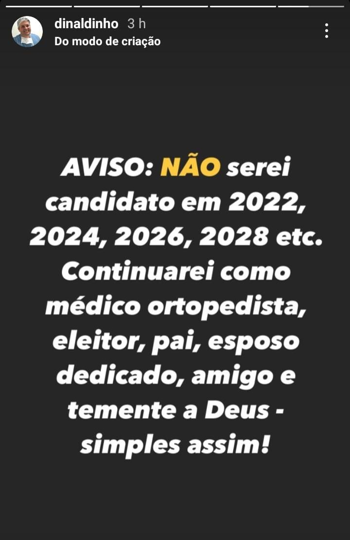 Após ser afastado do cargo de prefeito de Patos em 14 de agosto de 2018 e terminando o mandato afastado e no ostracismo político, o médico Dinaldo Filho usou suas redes sociais nesta terça-feira (06), para afirmar categoricamente que está abandonando a vida política.