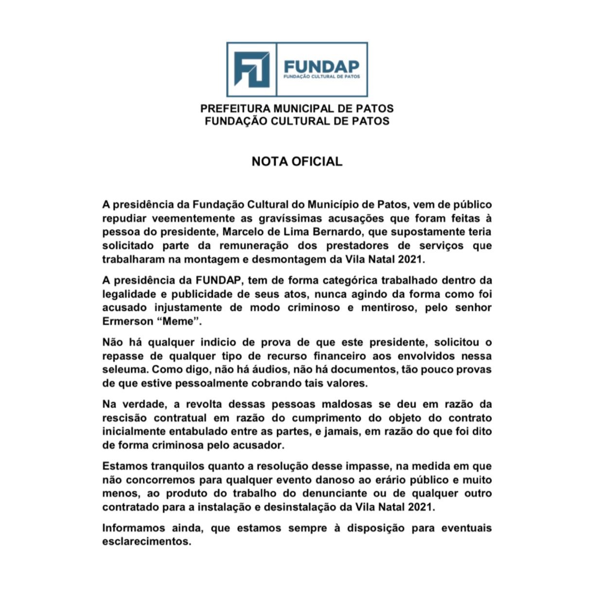 O prefeito de Patos, Nabor Wanderley, exonerou o presidente da Fundação de Cultura de Patos (FUNDAP), Marcelo Lima, alvo de denúncia nesta quinta-feira (10) por meio de um áudio vazado que foi parar em uma emissora de rádio dando conta de uma suposta rachadinha envolvendo ele e um prestador de serviço do órgão.